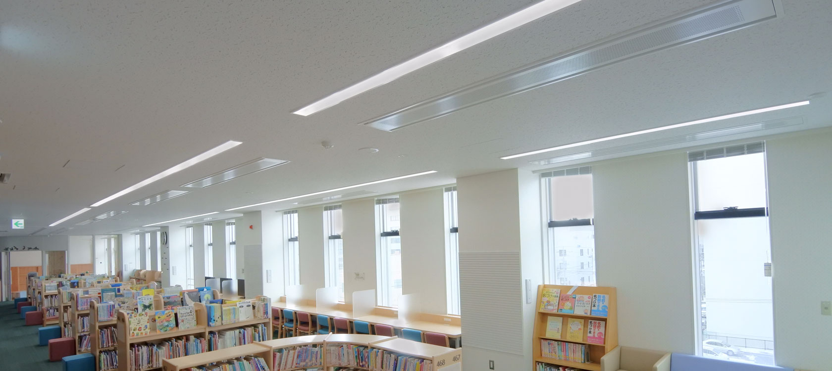 「くつろげる空間」を実現するために、釧路市中央図書館では湿度と気流に配慮した空調システムを採用しています。このシステムでは機械室に外気と室内還気を取り込み、「空冷直膨式高性能エアハン」で除湿または加湿し、ペリメーターに設置した「誘引エアビーム」から給気します。
