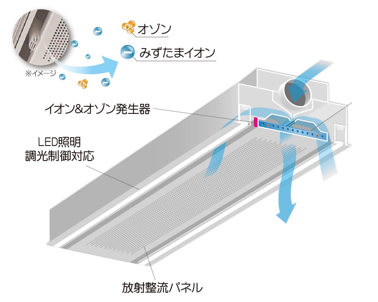 イオン・オゾン発生器やLED照明の組込みが可能です。イオン・オゾン発生器は空調用加湿器から供給される水分と結合してマイナスイオン化を促進し、空気清浄効果を高めます。