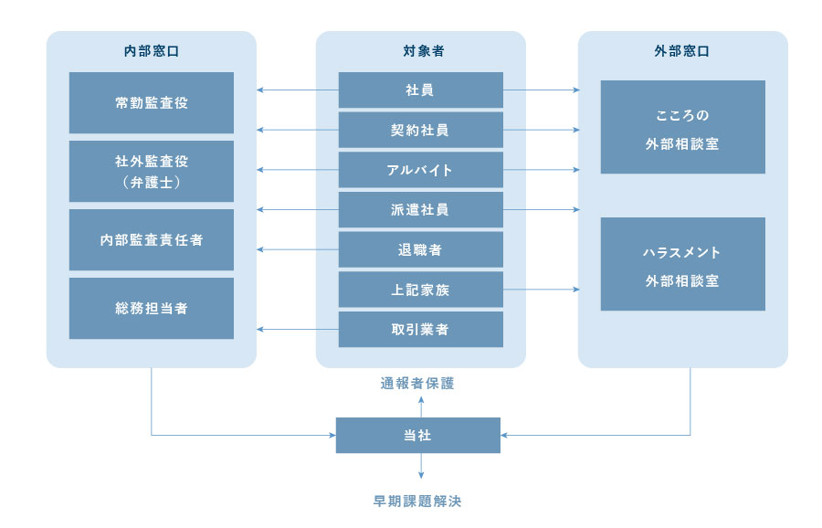 木村工機は、内部通報制度として社外取締役監査等委員、内部監査部門、総務部門等を窓口とするコンプライアンス相談窓口を設置しています。当社の社員、契約社員、アルバイト、派遣労働者、退職者、および当社の取引事業者の社員等を利用対象者とし、違法行為が発生、または発生するおそれがある事案を早期に把握し適切な対応が取れるようにしています。