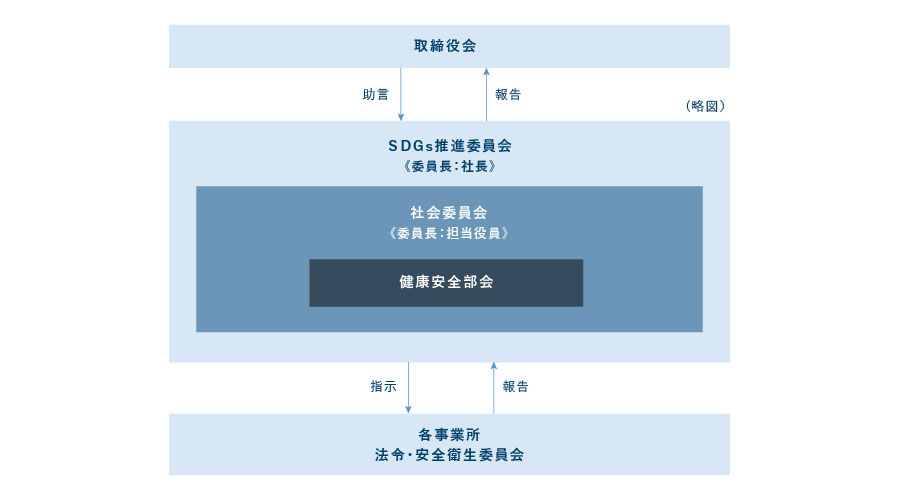健康経営の推進体制は、取締役会直轄の「SDGs推進委員会(委員長:社長)」の部会である「健康安全部会」が中心となり、各事業所の法令・安全衛生委員会と連携し推進しています。